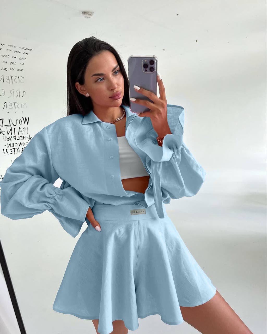 Головна » Магазин » Одяг » Жіночі костюми » Легкий костюм на лето (рубашка+шорты) лен голубой