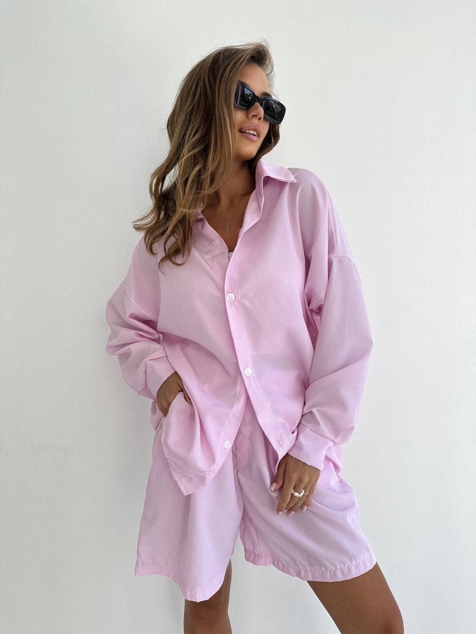 Будьте першим, хто залишив відгук “Легкий костюм Рубашка оверсайз и шорты на высокой посадке коттон розовый в полоску”“