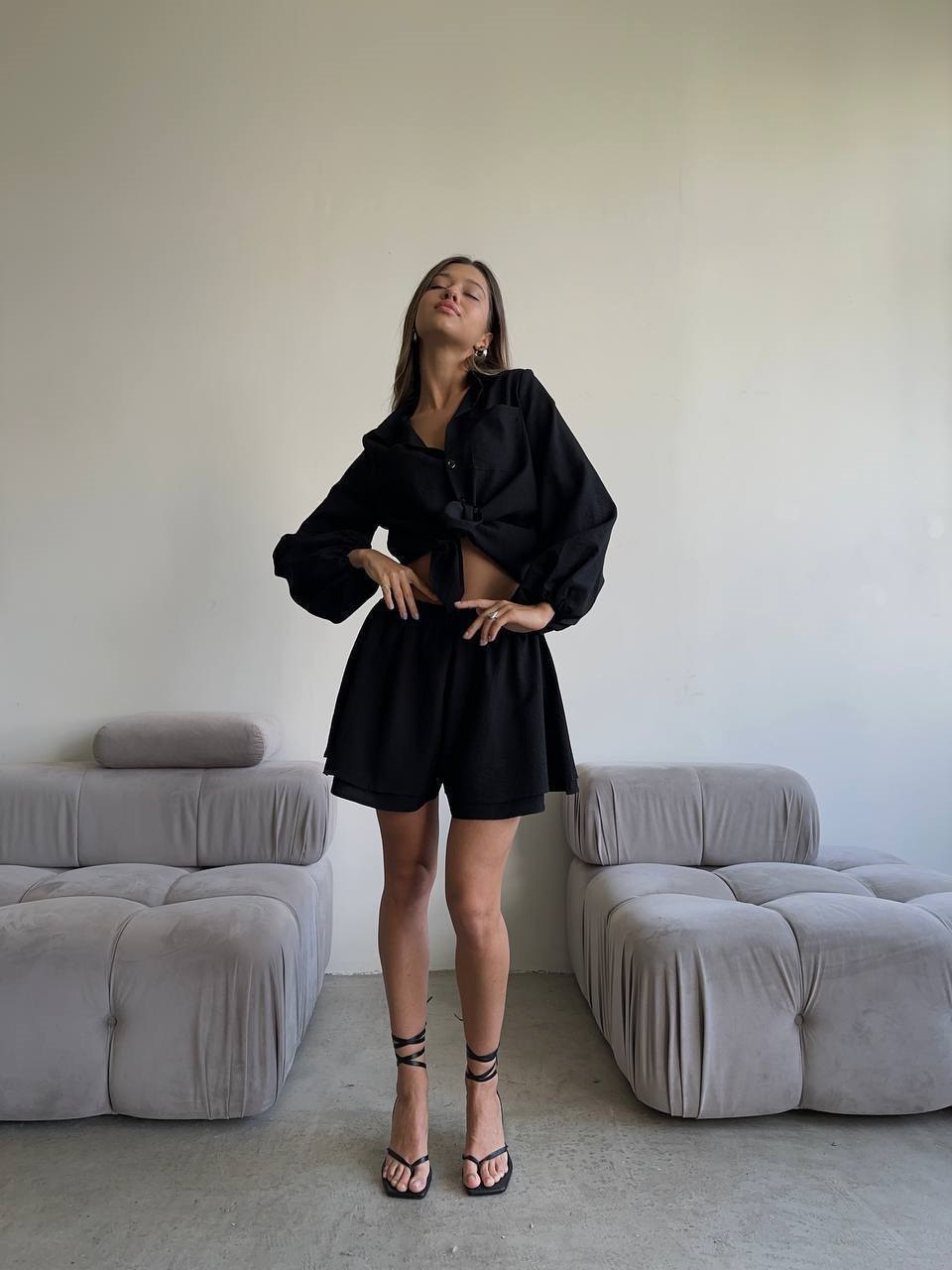 Головна » Магазин » Одяг » Жіночі костюми » Легкий костюм (рубашка с пышными рукавами+широкие шорты) черный