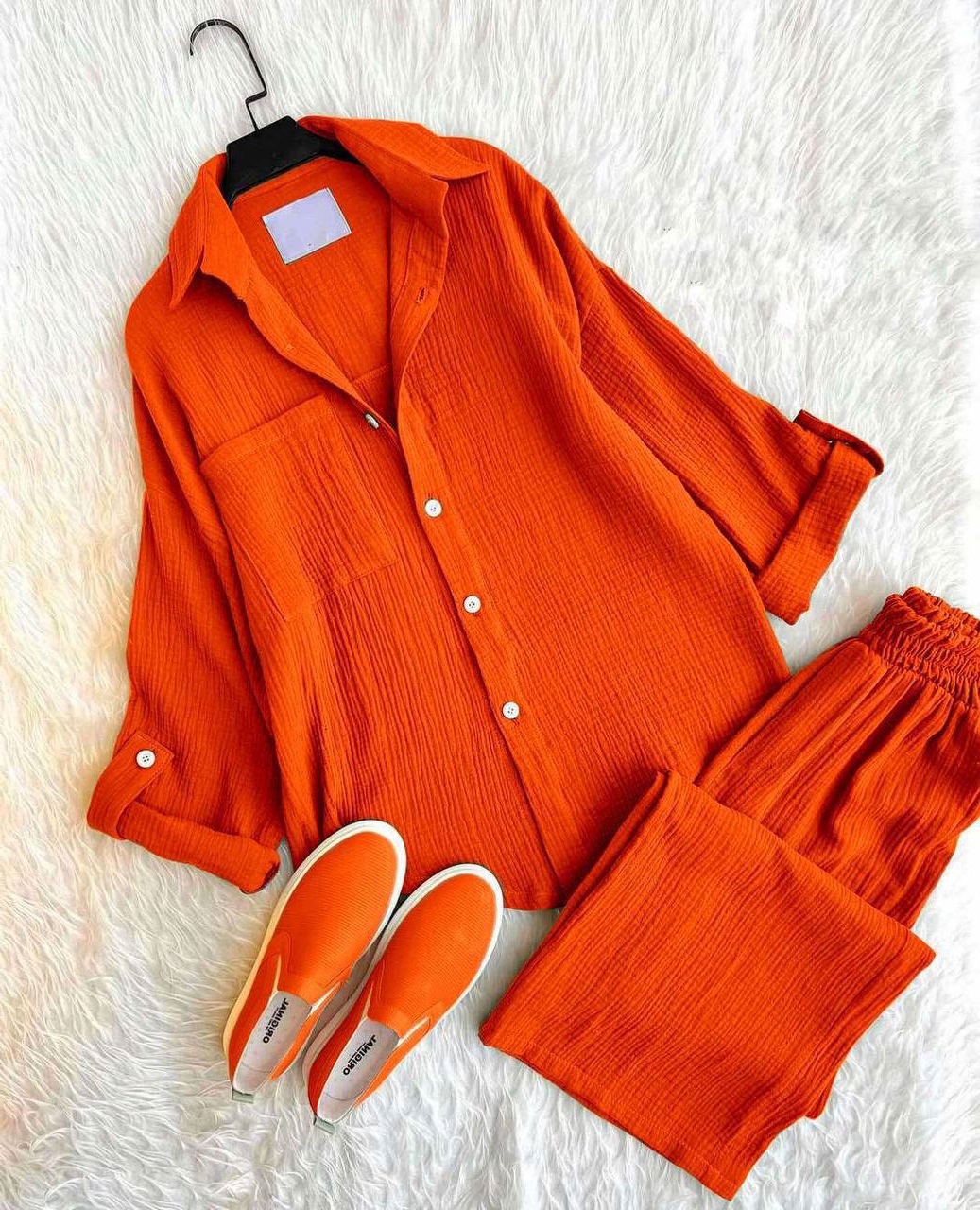 Головна » Магазин » Одяг » Жіночі костюми » Легкий костюм рубашка+штаны с карманами оранж