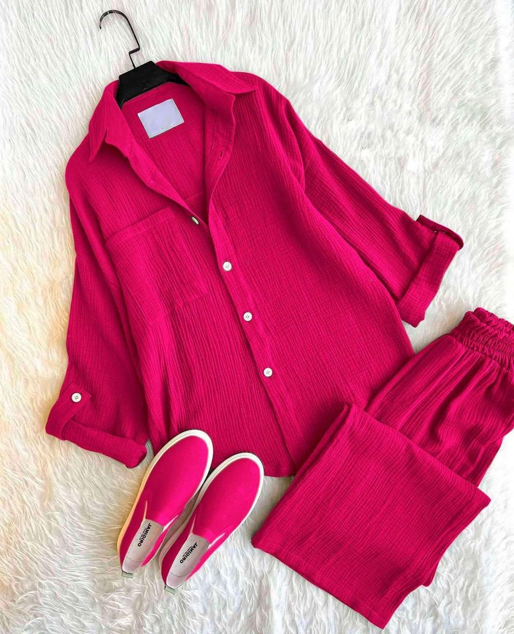 Головна » Магазин » Одяг » Жіночі костюми » Легкий костюм рубашка+штаны с карманами малина