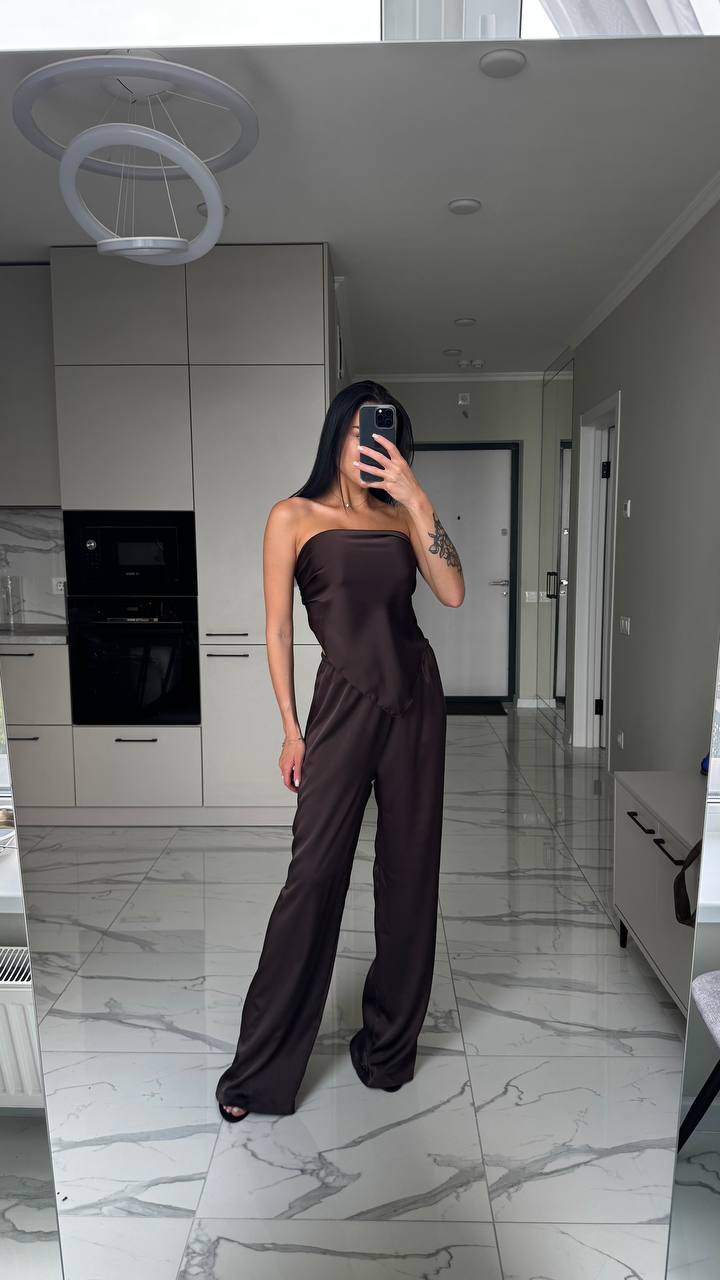 Легкий костюм с топом-бандо и широкими штанами шоколад