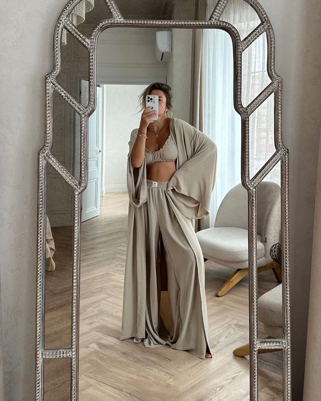 Головна » Магазин » Одяг » Жіночі костюми » Легкий костюм свободного кроя тройка (топ+длинный кардиган+брюки) бежевый