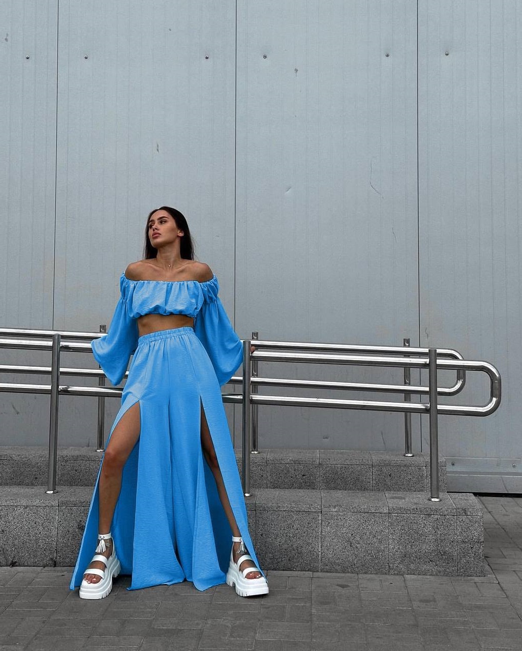 Легкий костюм топ с длинным рукавом и брюки с высокими разрезами голубой