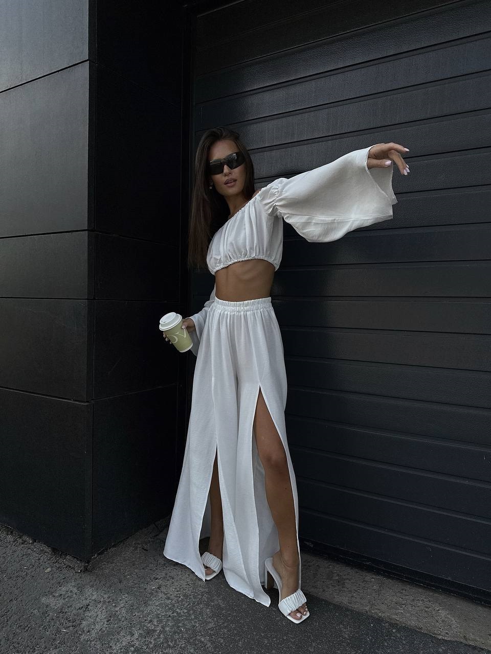 Легкий костюм топ с длинным рукавом и брюки с высокими разрезами белый