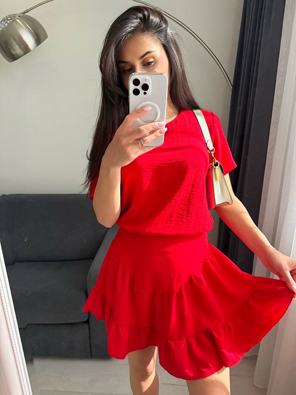 Легкий костюм жатка (кофточка+юбка с воланами длиной мини) красный
