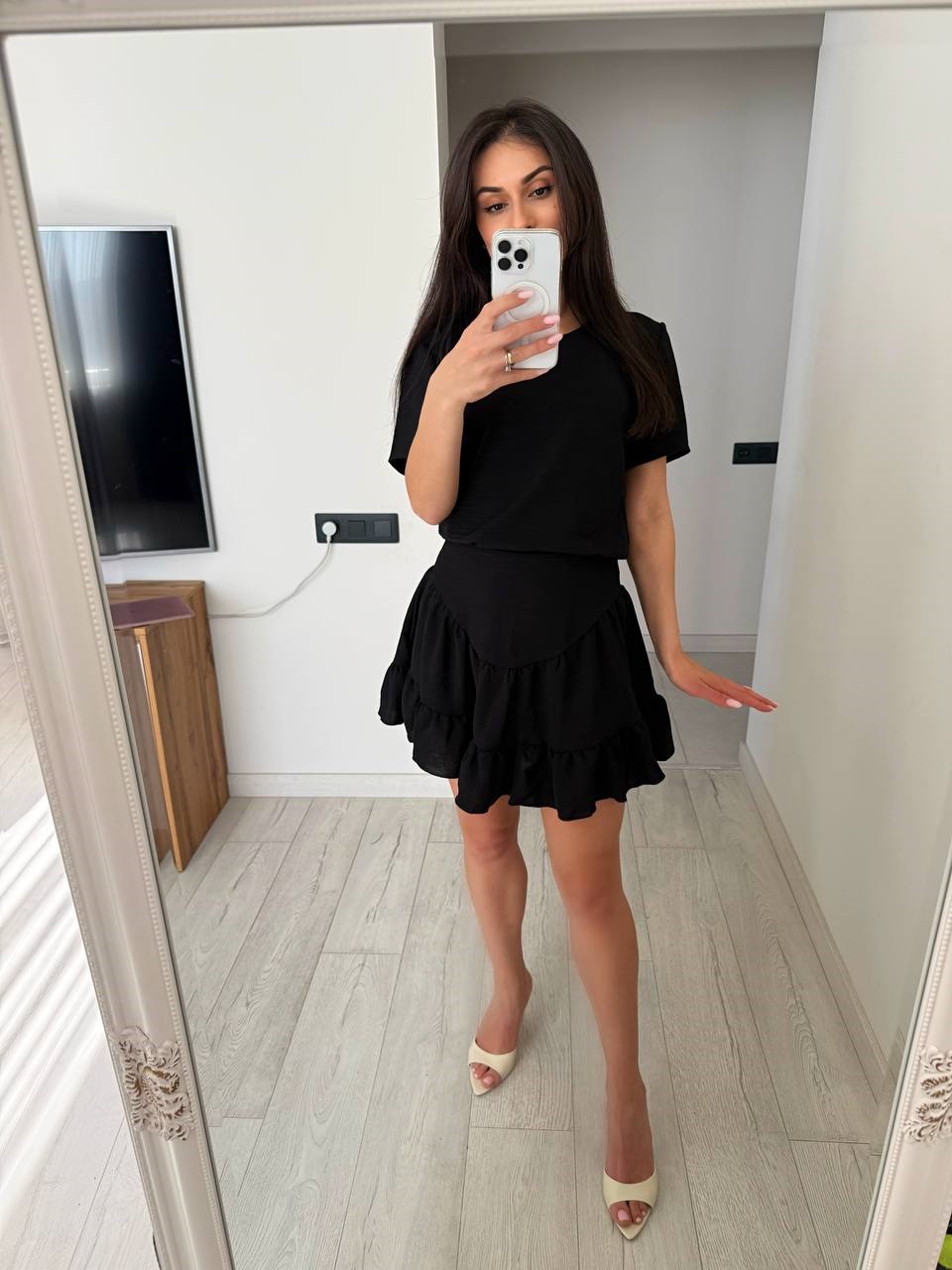 Легкий костюм жатка (кофточка+юбка с воланами длиной мини) черный
