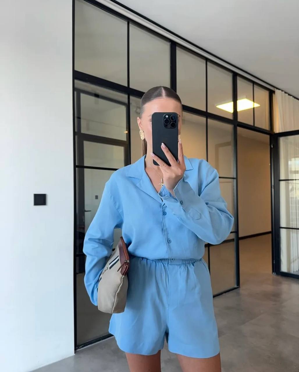 Легкий льняной костюм (шорты + рубашка с длинным рукавом) голубой