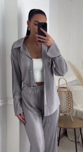 Будьте першим, хто залишив відгук “Легкий приятный к телу костюм из ткани гофре (рубашка+свободного кроя брюки) серый”“