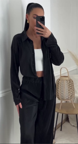 Легкий приятный к телу костюм из ткани гофре (рубашка+свободного кроя брюки) черный