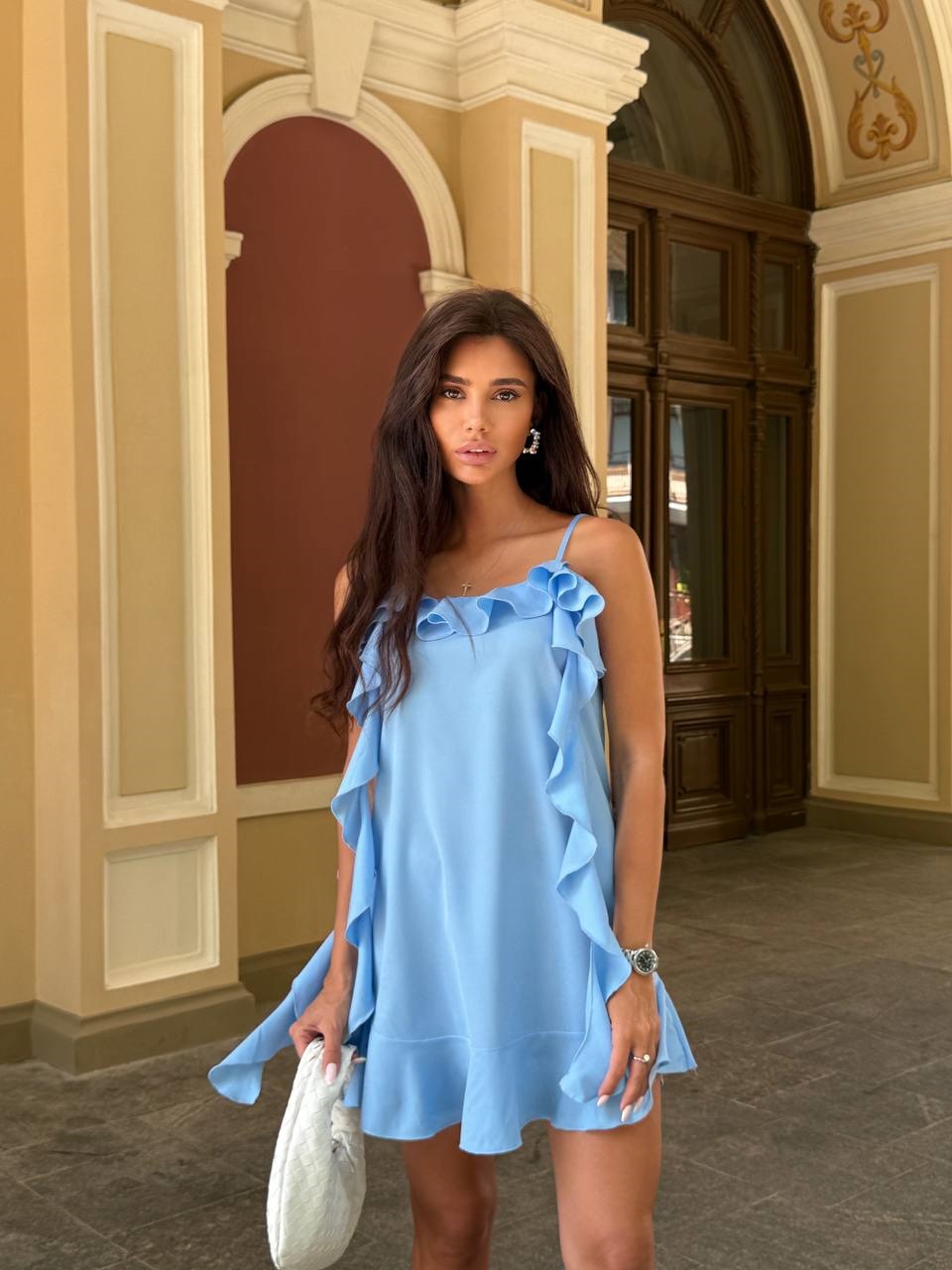 Будьте першим, хто залишив відгук “Легкий шелковистый сарафан с оборочками свободного кроя голубой”“
