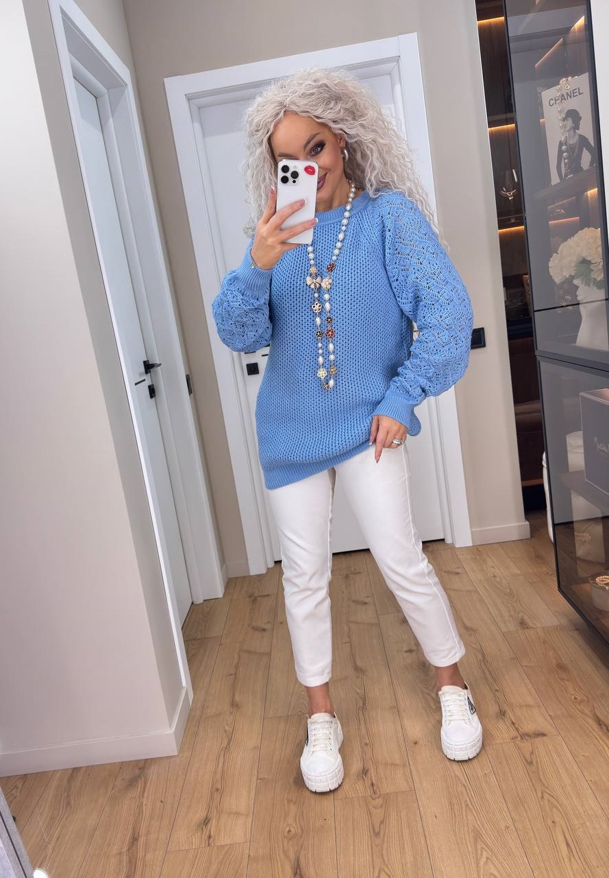 Мягкая фактурная вязка совмещенная с ажурными рукавами создает нежный и стильный образ.