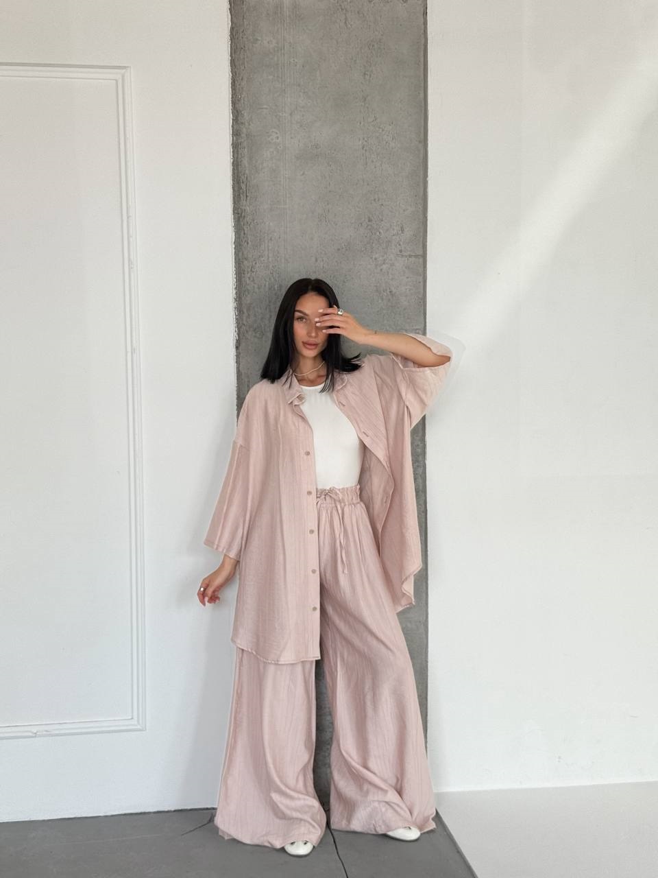Легкий свободный костюм (брюки+рубашка) бежевый