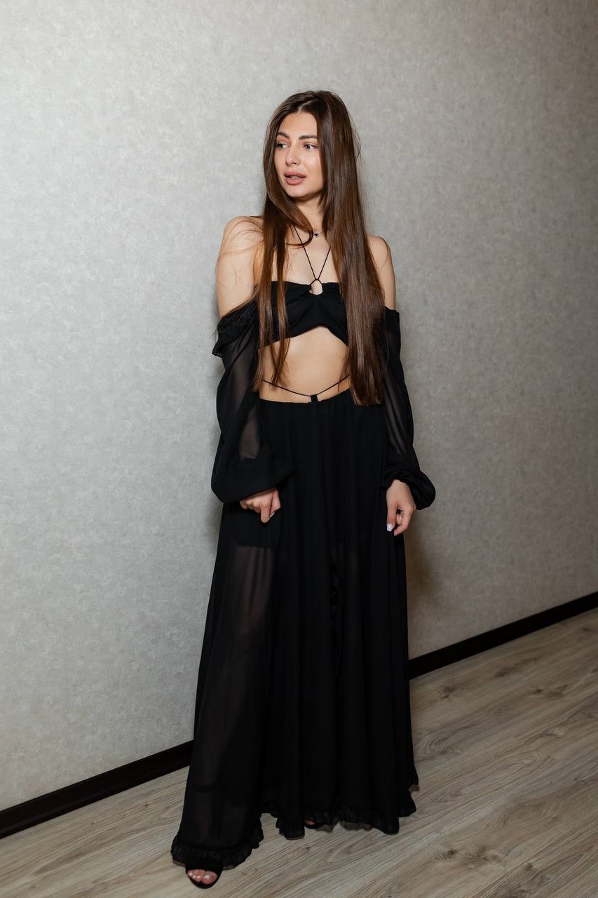 Головна » Магазин » Одяг » Жіночі костюми » Легкий воздушный костюм (топ с рюшами+расклешенная юбка) черный