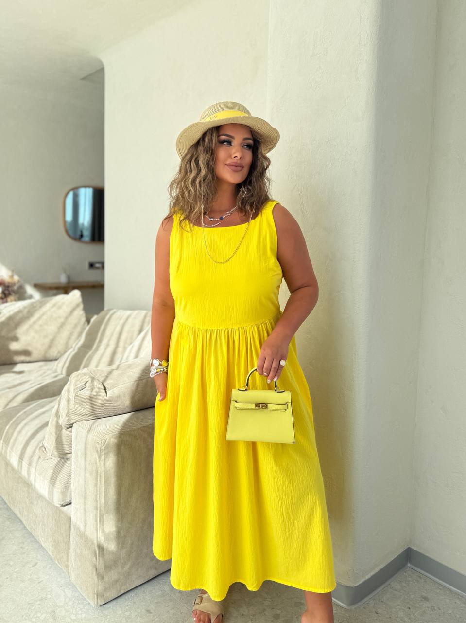 Легкое летнее платье в жаркую погоду. От талии свободного кроя, с карманами. Широкие бретели-резинки.