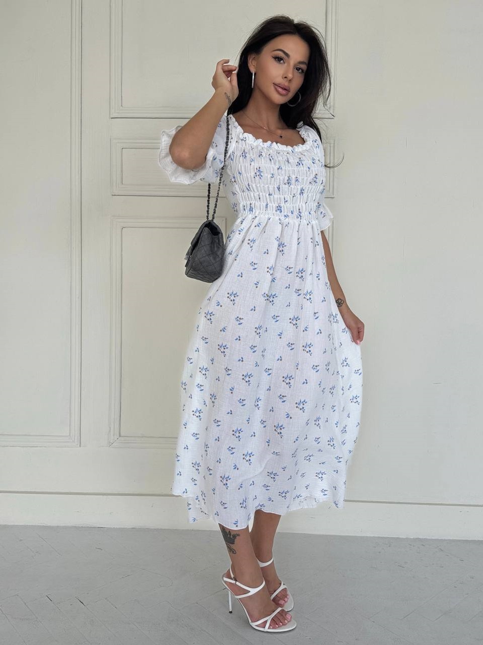 Легкое платье из муслина полочка прострочена резинкой в цветочный принт белый