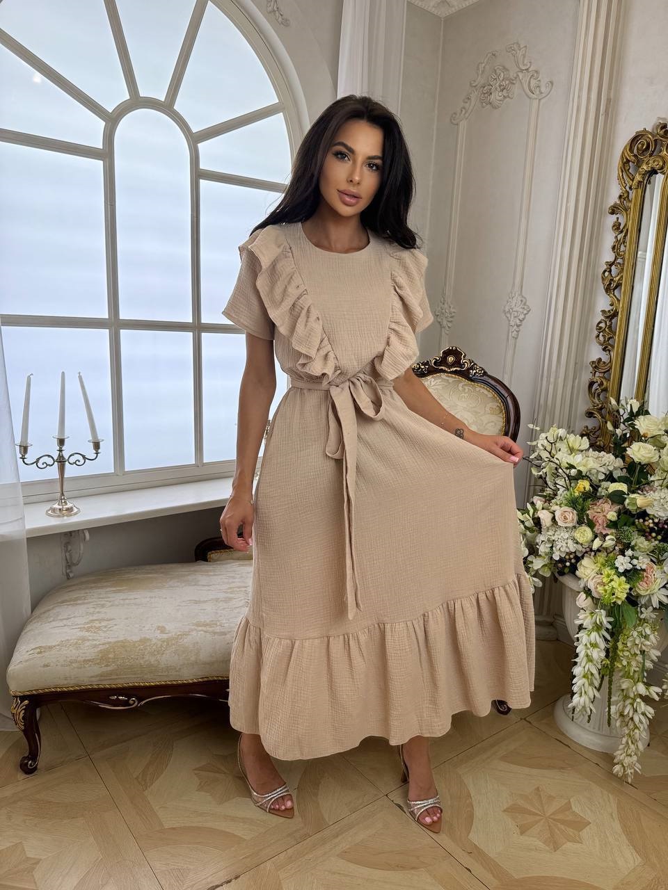 Легкое платье из муслина с воланом по юбке+рюшами по полочке бежевый