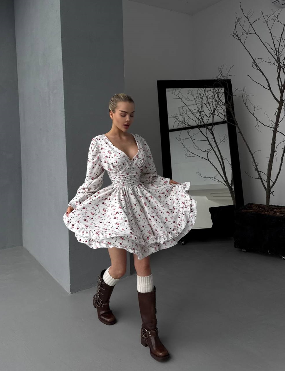 Будьте першим, хто залишив відгук “Легкое Платье с пышными рукавами+двойной юбкой солнце клеш с рюшами белый в розовый цветок”“
