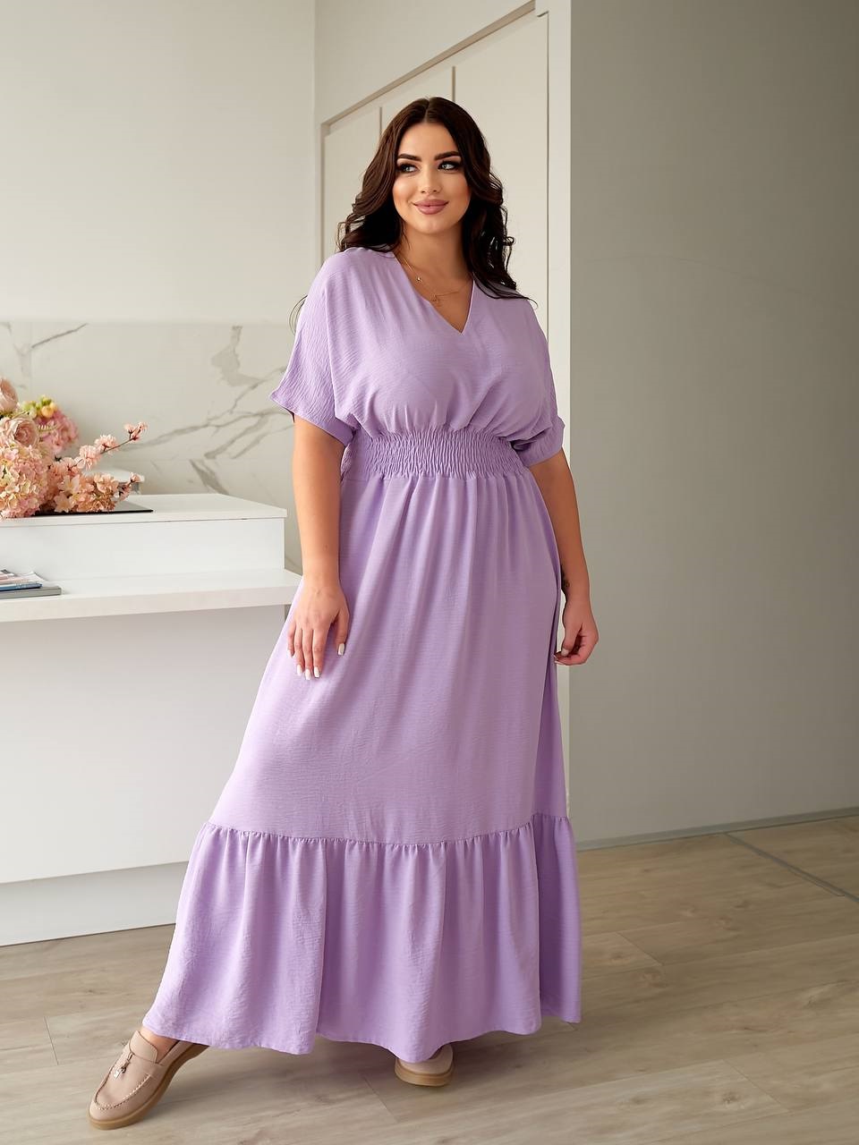 Легкое Платье с расклешенной юбкой+воланом по низу+по талии резинка сиреневый