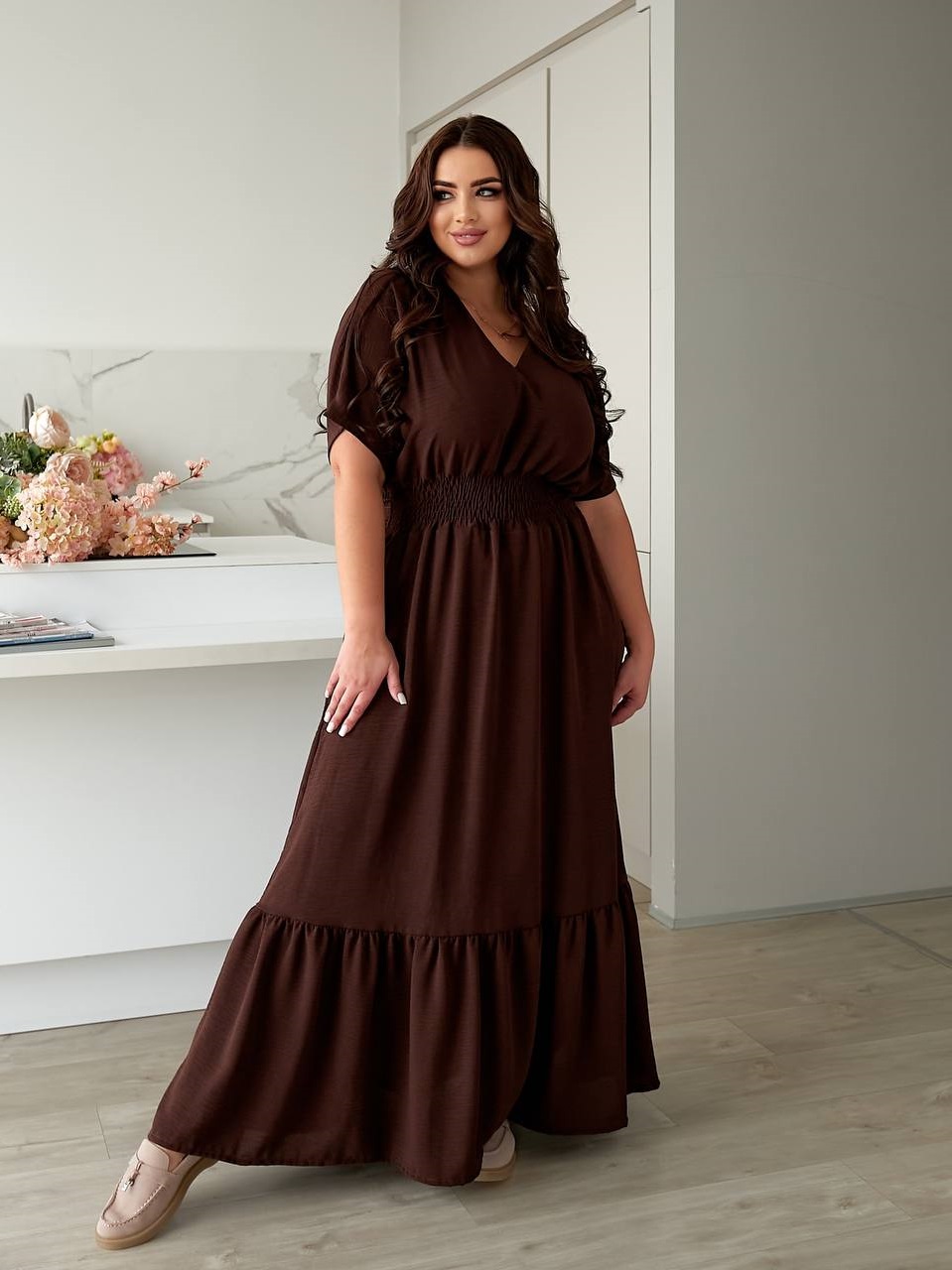 Легкое Платье с расклешенной юбкой+воланом по низу+по талии резинка шоколад