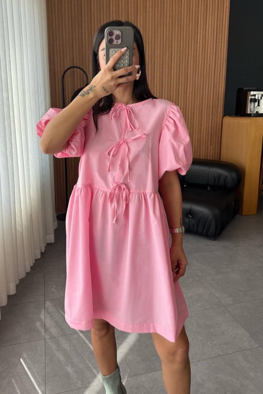 Летнее платье свободного кроя с пышными рукавами+завязочками по полочке розовый