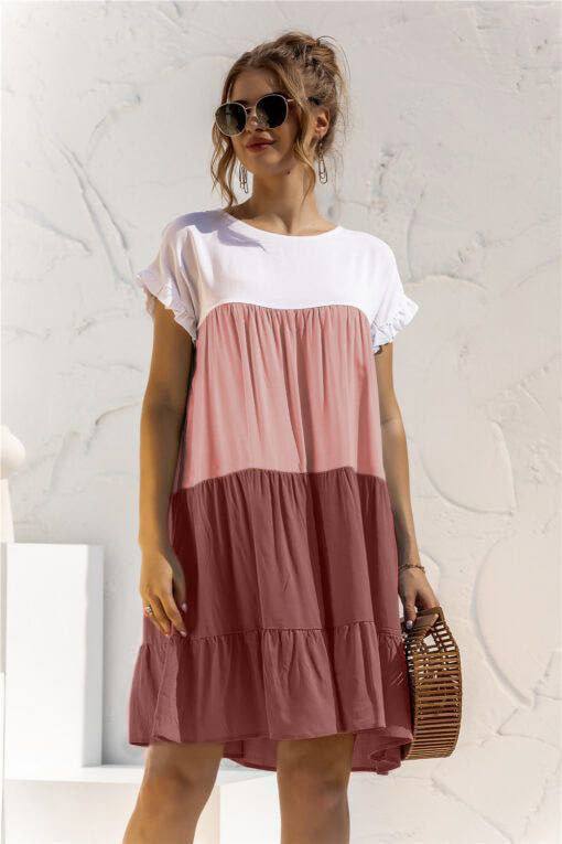 Летнее легкое платье с оборками на рукавах, легкое, воздушное. С цветным блоком, свободным кроем и пышными складками.
