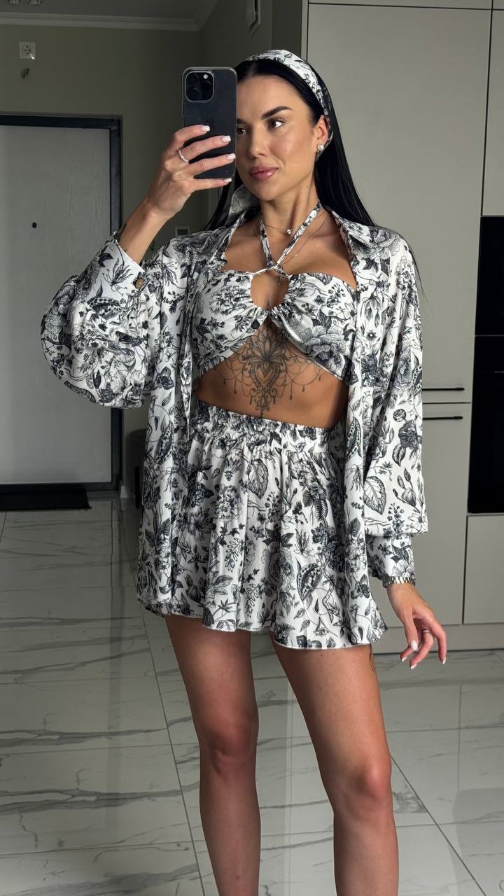 Комплект из 4 стильных элементов: платок, кроп-топ с акцентной завязкой, свободная рубашка оверсайз и шорты с высокой талией✨