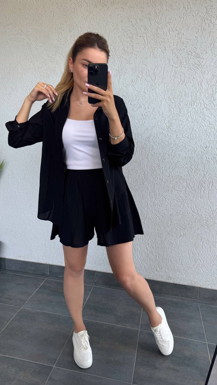 Костюм рубашки застегивается на пуговицы, юбка-шорты талия на резинке.