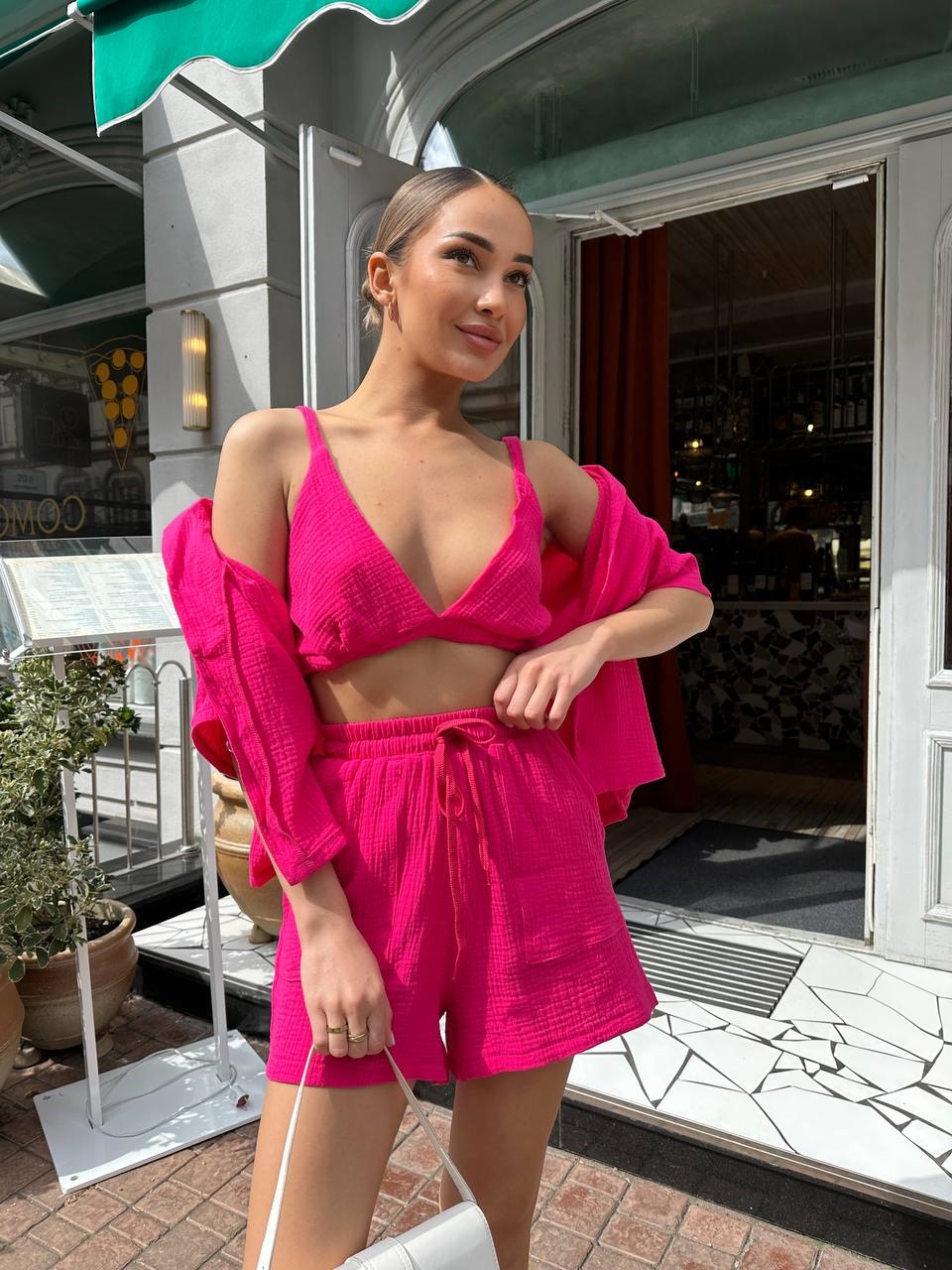 Головна » Магазин » Одяг » Жіночі костюми » Летний костюм из легкого муслина (топ+рубашка+шорты) малина