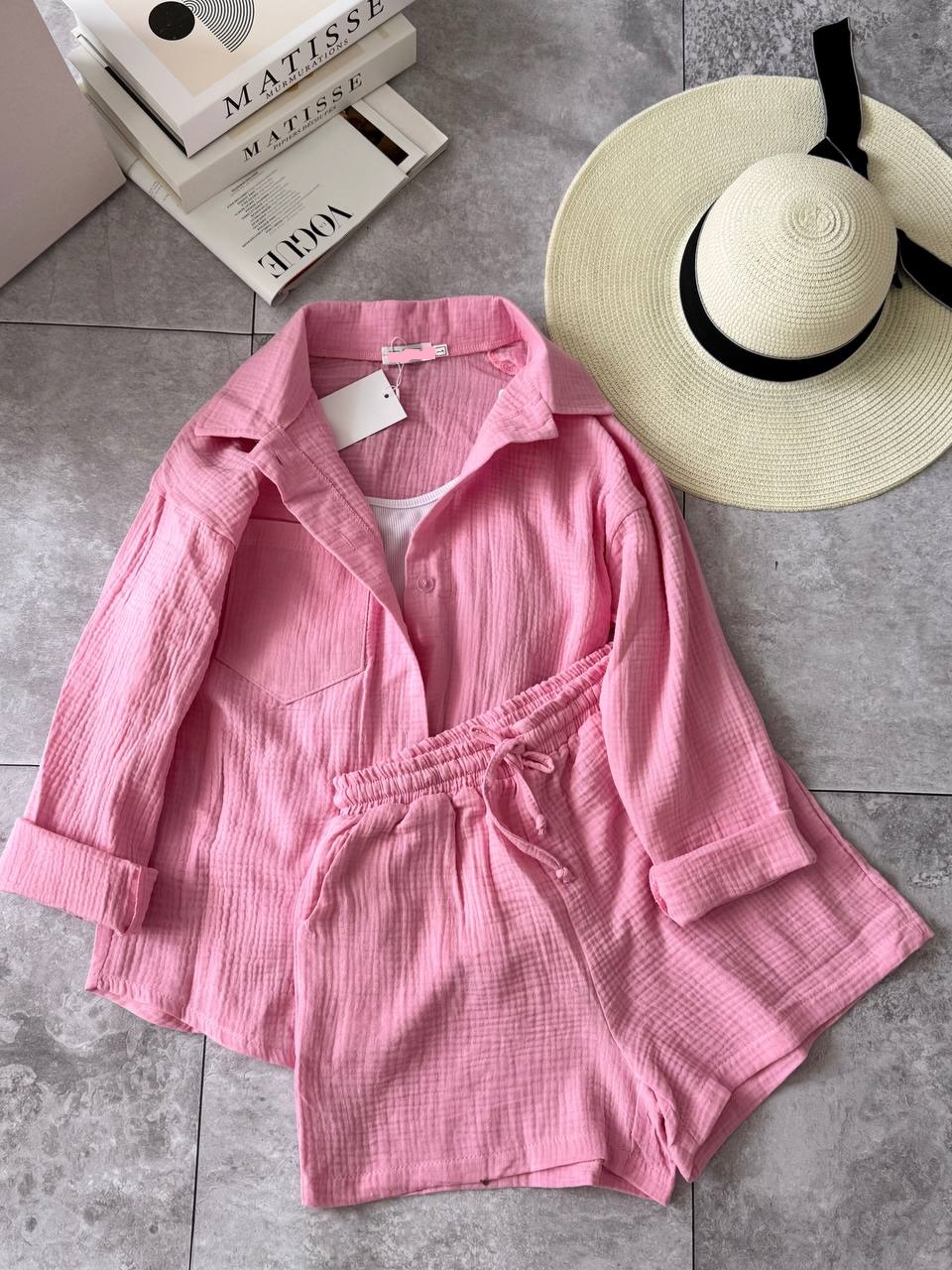 Летний костюм из муслина (шорты+рубашка с длинным рукавом) нежно-розовый