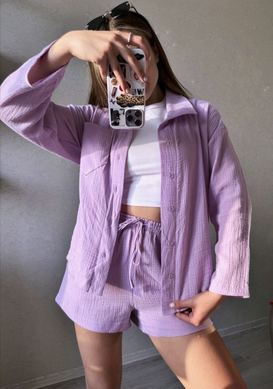 Летний костюм из муслина (шорты+рубашка с длинным рукавом) сиреневый