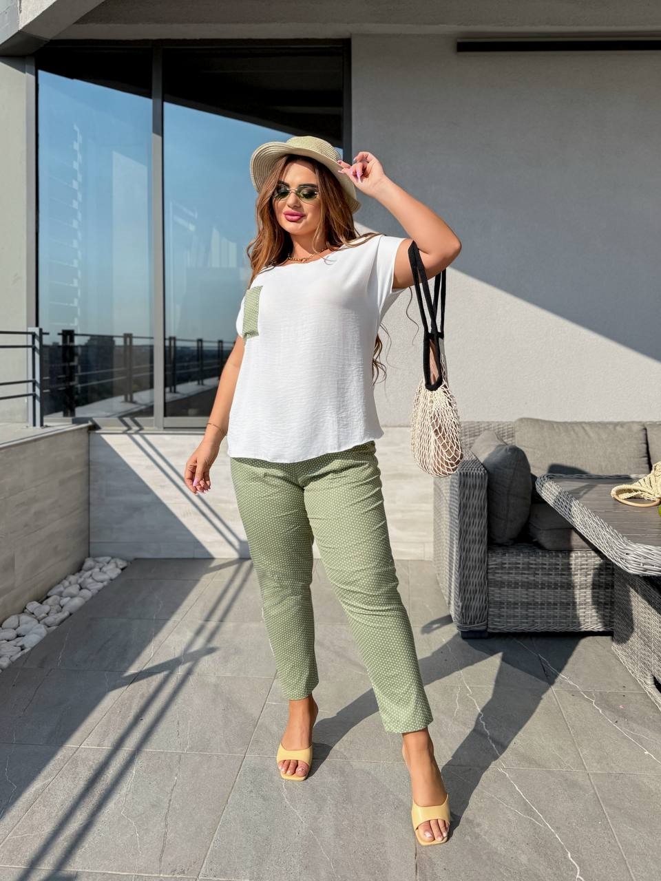 Летний костюм (кофточка из креп-жатки+брюки из коттона принт горошки) оливка