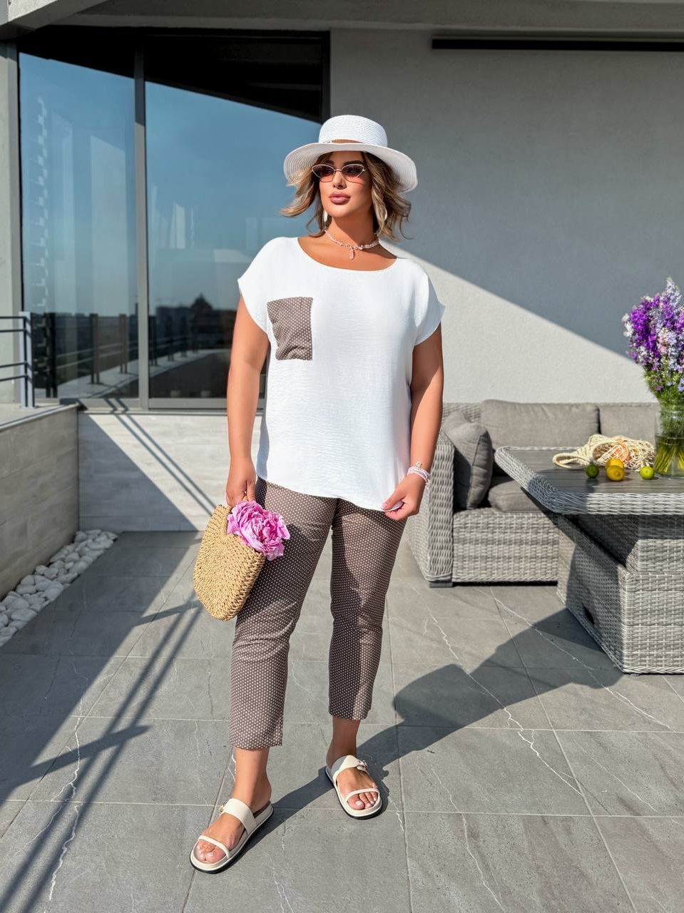 Летний костюм (кофточка из креп-жатки+брюки из коттона принт горошки) капучино