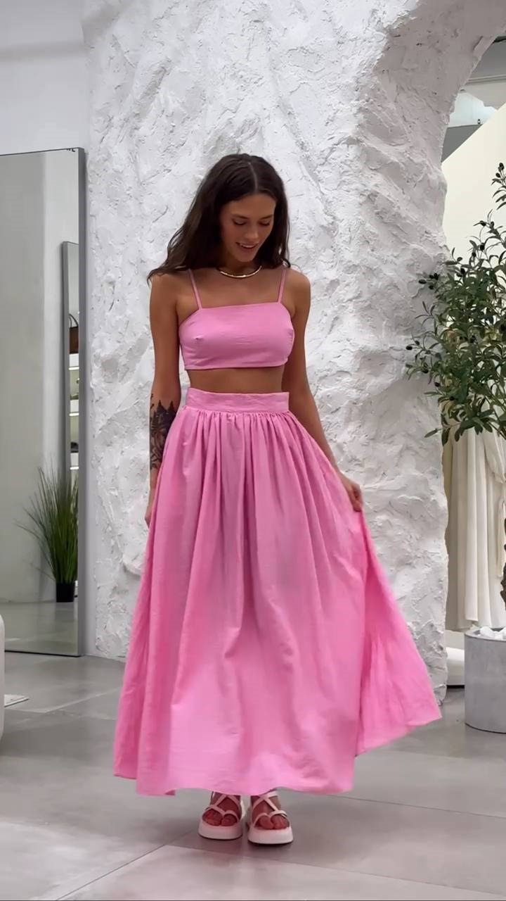 Будьте першим, хто залишив відгук “Летний костюм (короткий топ на тонких бретелях+пышная юбка длиной макси) розовый”“