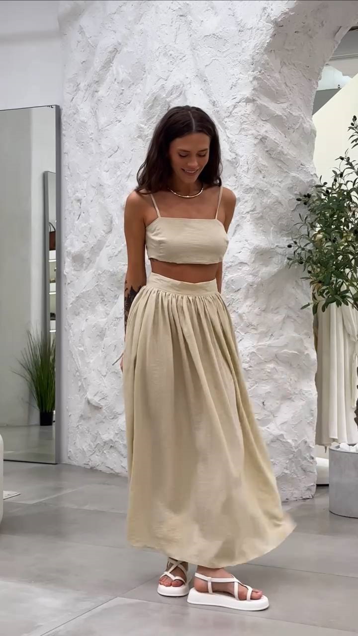 Будьте першим, хто залишив відгук “Летний костюм (короткий топ на тонких бретелях+пышная юбка длиной макси) бежевый”“