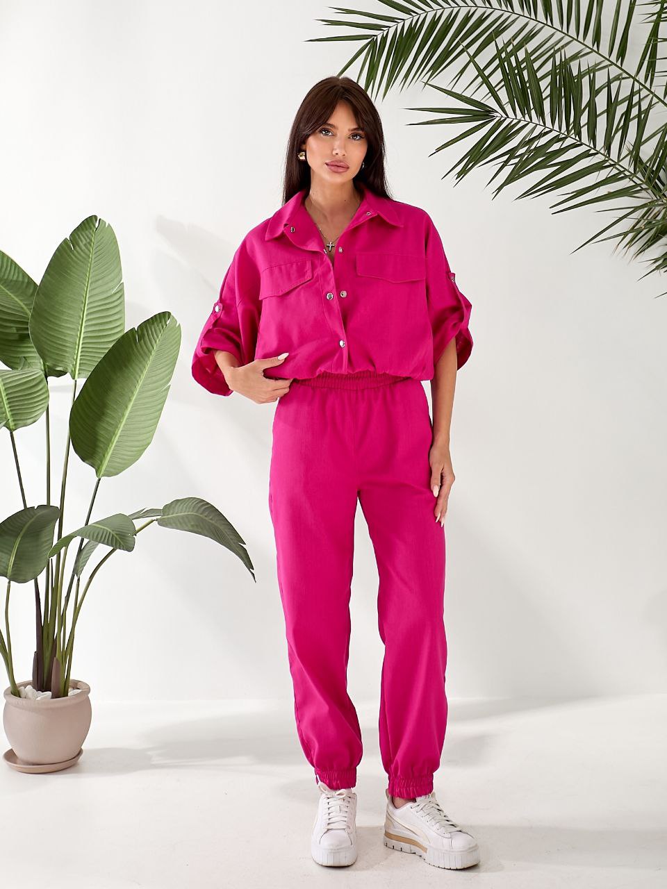 Головна » Магазин » Одяг » Жіночі костюми » Летний костюм: рубашка на молнии+брюки на манжетах малина