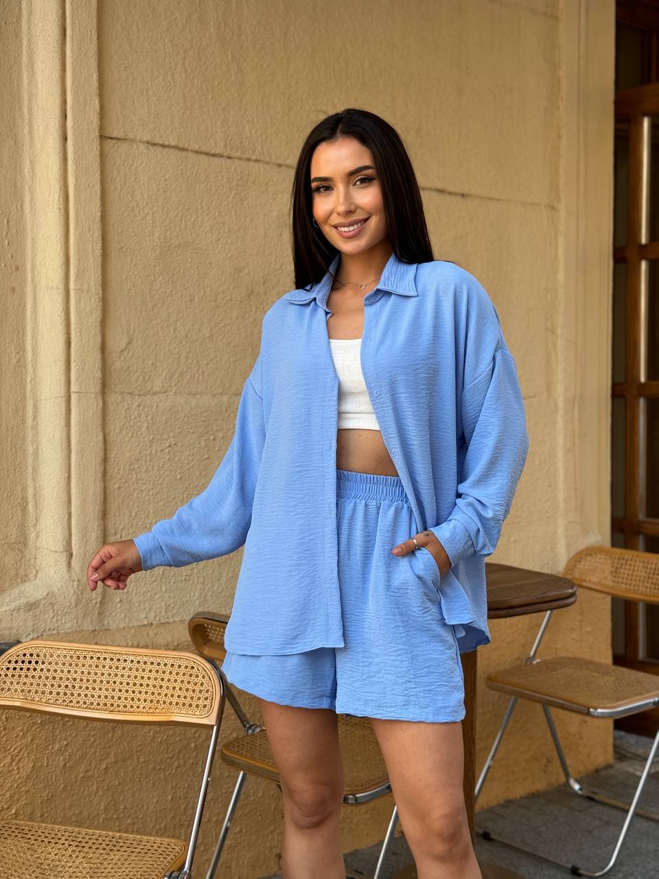 Летний костюм с креп жатки: рубашка свободная+шорты с поясом на резинке джинс