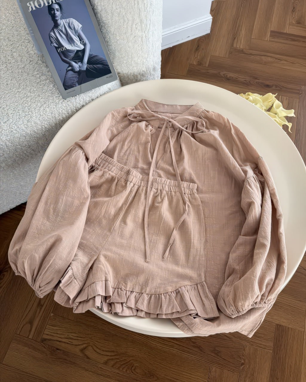 Стильный льняной костюм с нежными воланами – идеальный вариант для летних прогулок и отдыха.