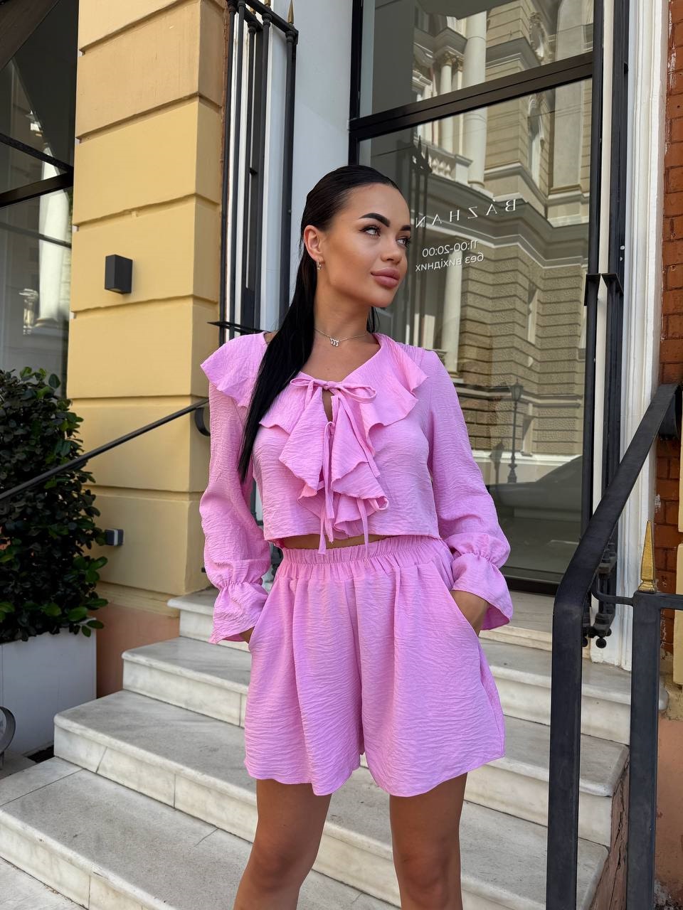 Летний костюм (шорты+блуза с воланами на завязочках) розовый