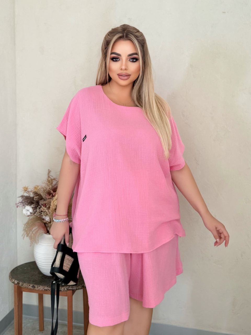 Летний костюм свободного кроя (блузка с короткими рукавами+шорты-юбка) розовый