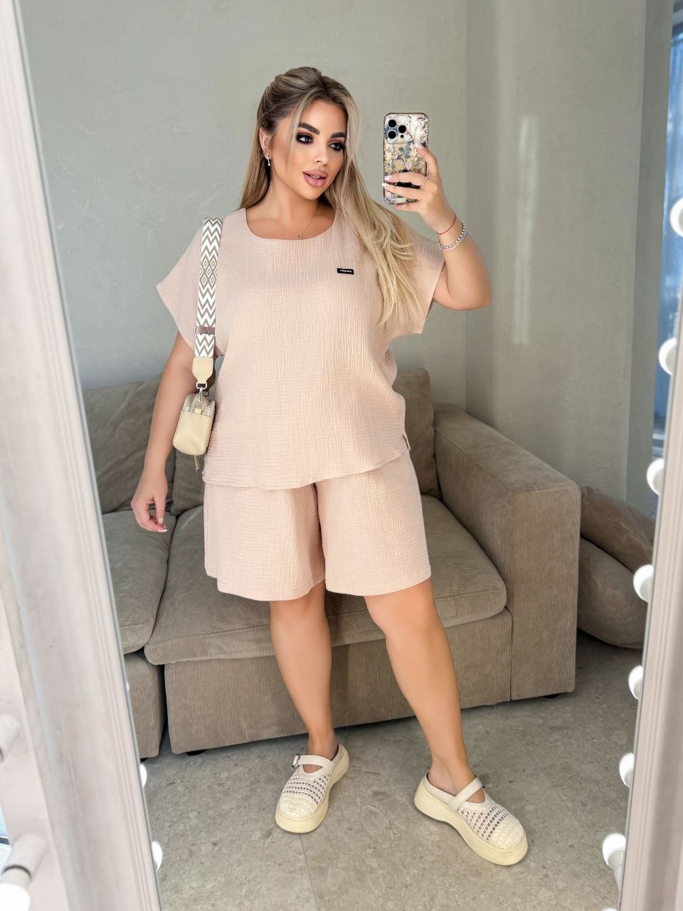 Летний костюм свободного кроя (блузка с короткими рукавами+шорты-юбка) бежевый