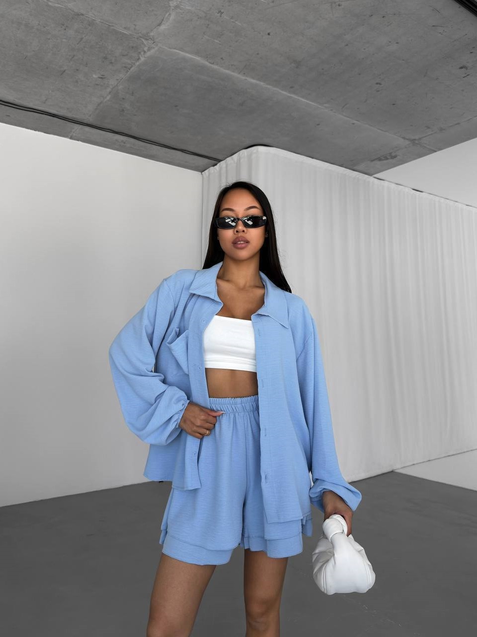Головна » Магазин » Одяг » Жіночі костюми » Летний костюм свободного кроя (двойные шорты+рубашка) голубой