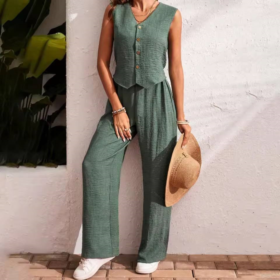 Головна » Магазин » Одяг » Жіночі костюми » Летний костюм (свободные брюки+жилет) олива