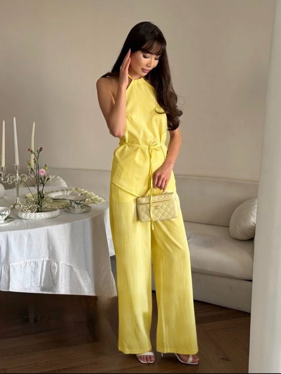 Летний костюм (топ с открытой спинкой и завязками на шее+свободные брюки) желтый