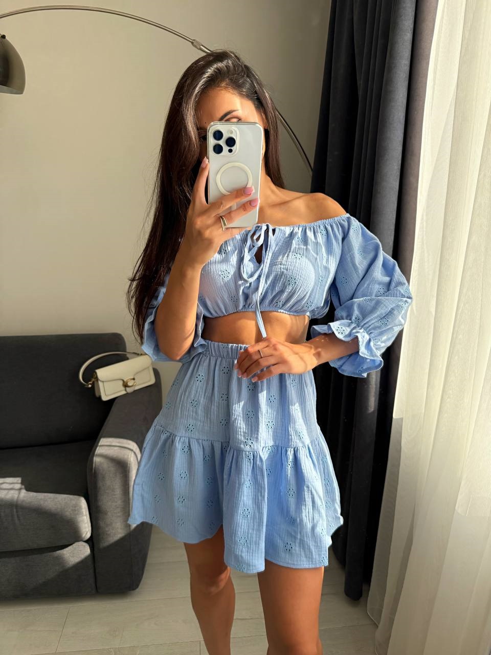 Головна » Магазин » Одяг » Жіночі костюми » Летний Костюм (топ с рукавом 3/4+мини юбка с воланом) прошва голубой