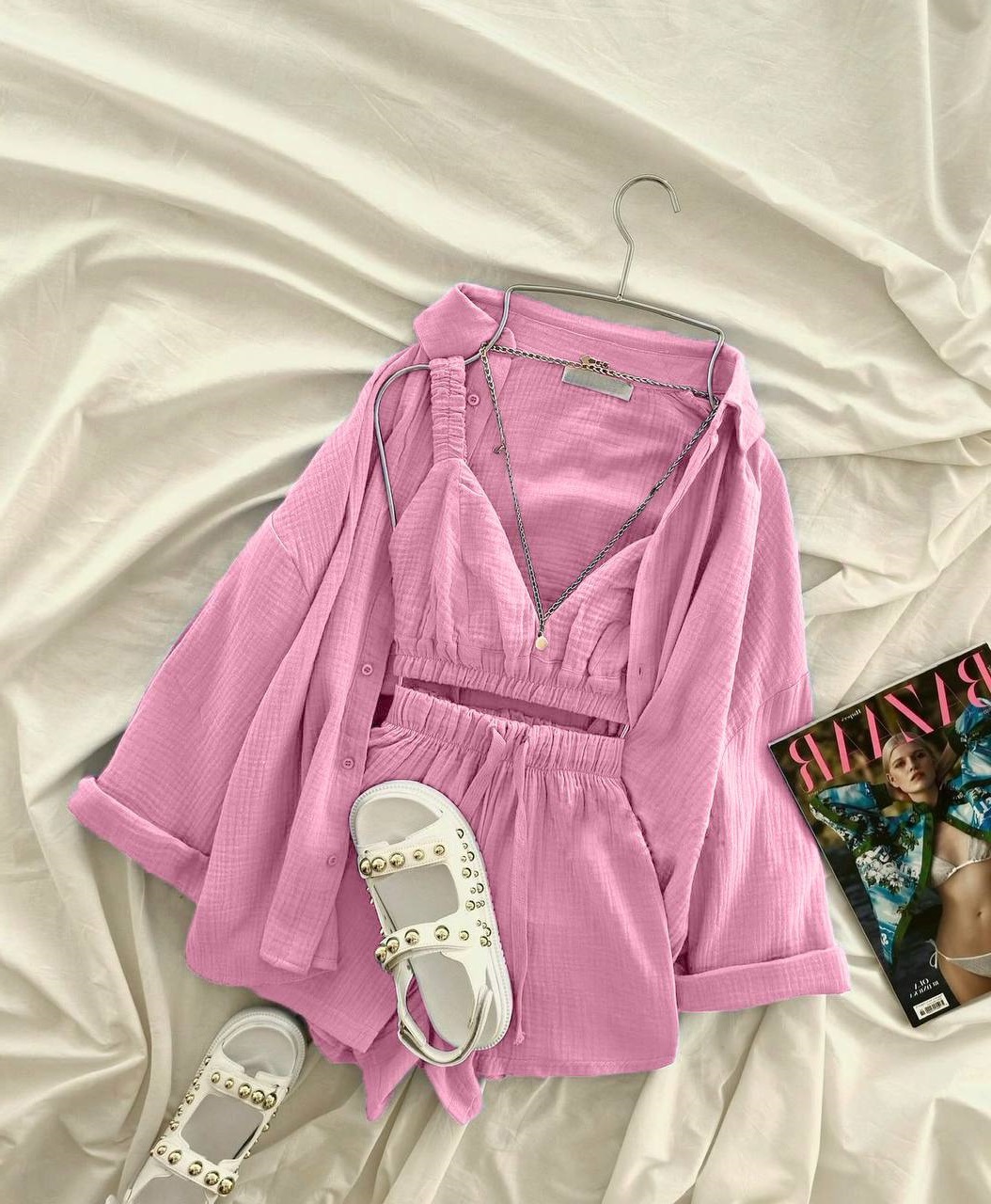 Головна » Магазин » Одяг » Жіночі костюми » Летний костюм тройка из муслина (топ+шорты+рубашка) барби