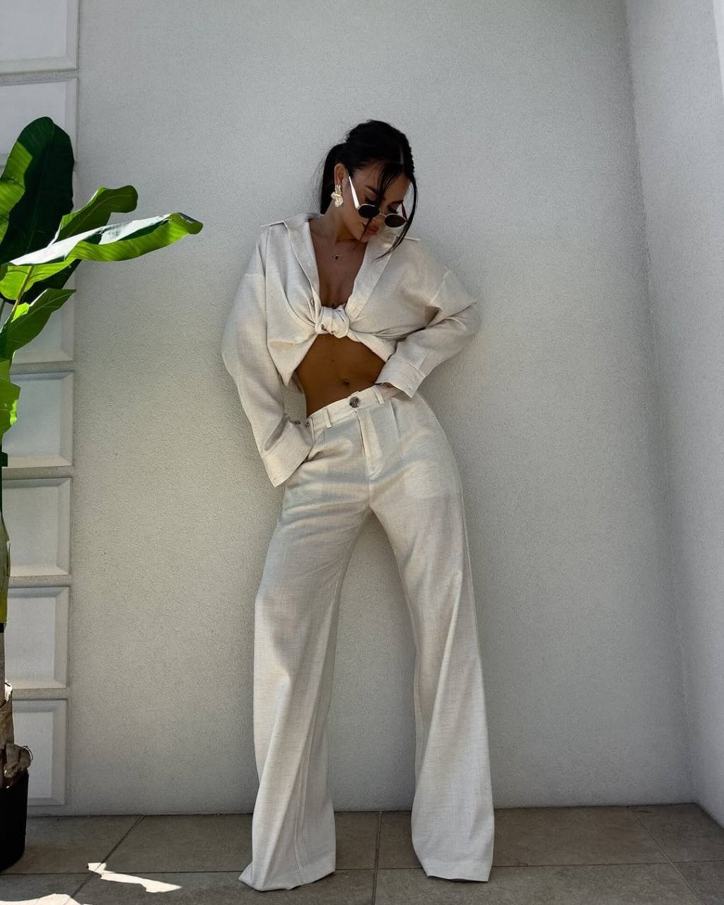 Ткань обеспечивает идеальную вентиляцию даже в самые жаркие дни, а свободный крой брюк и рубашки придает непринужденный шик.