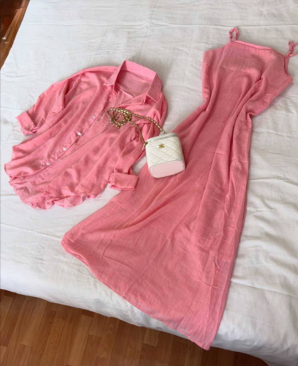 Летний льняной комплект – платье на тонких бретелях и легкая рубашка.