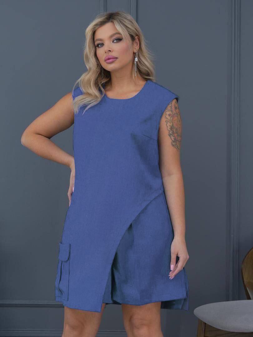 Летний льняной костюм Блуза-туника с фигурным вырезом на боку и шорты свободного кроя джинс
