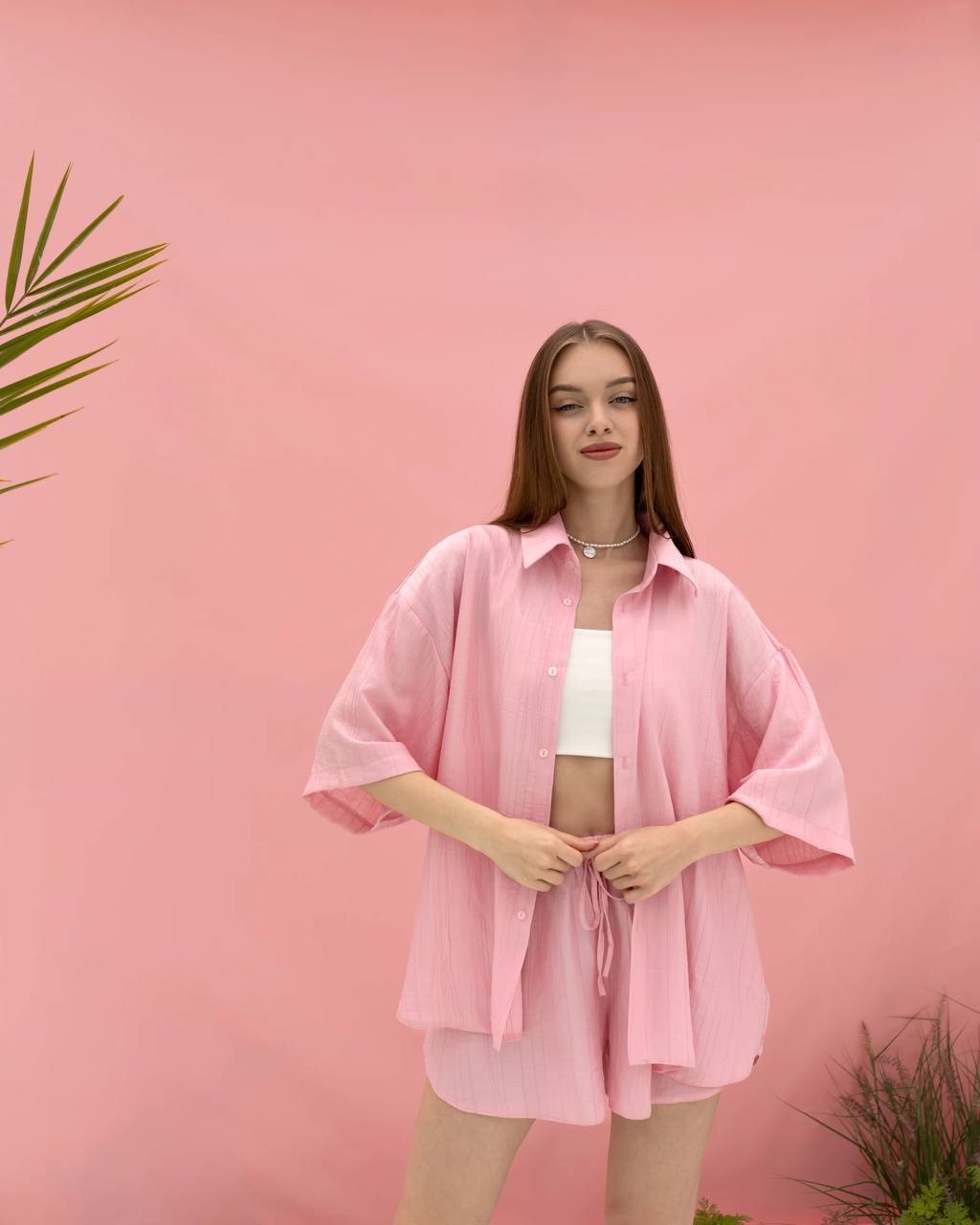 Этот дуэт – шорты и рубашка с укороченным рукавом – создан для лета, благодаря легкой, дышащей ткани с эффектом жатки.